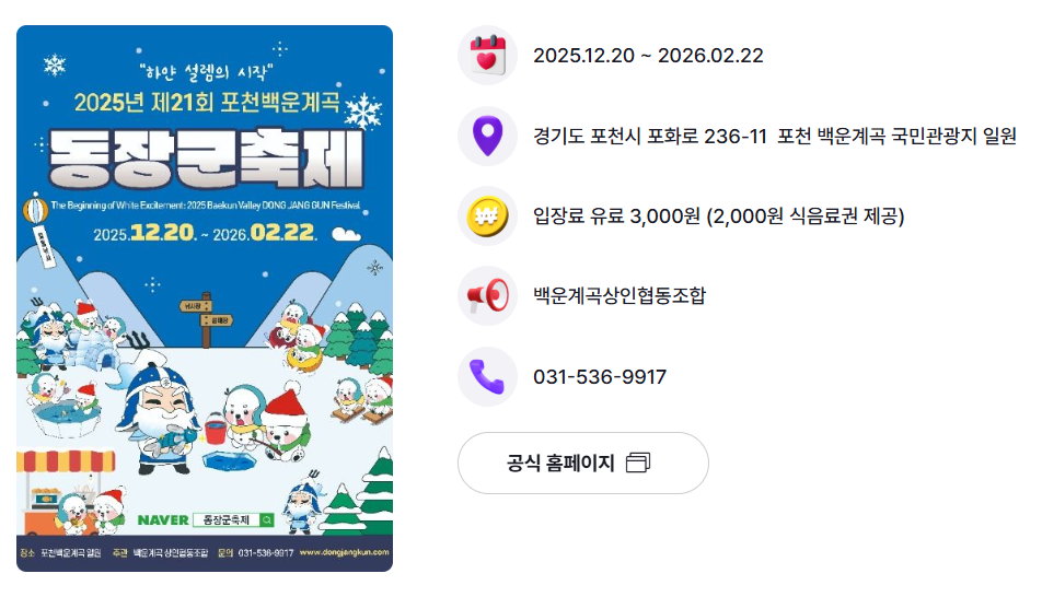 | 포천 백운계곡 동장군축제 | 2025.12.20 ~ 2026.02.22 | 유료 3,000원 (2,000원 식음료권 제공) |