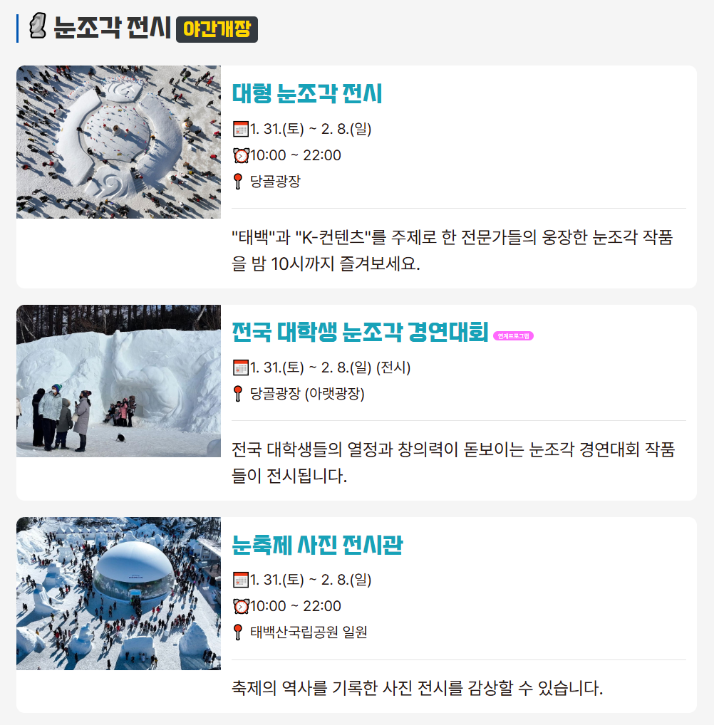 | 태백산 눈축제 | 2026.01.31 ~ 2026.02.08 | 무료 | 눈 조각·겨울 풍경 |