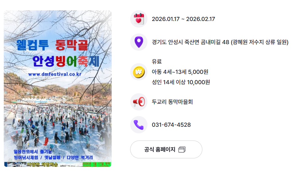 | 웰컴투 동막골 안성빙어축제 | 2026.01.17 ~ 2026.02.17 | 아동 5,000원 성인 10,000원 |