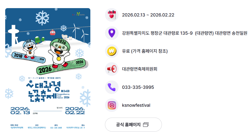 | 대관령 눈꽃축제 | 2026.02.13 ~ 2026.02.22 | 유료 (요금 홈페이지 참고) |