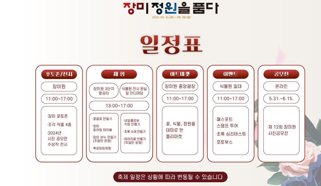 | 서울대공원 장미축제 | 5.31 ~ 6.8 | 과천 서울대공원 |